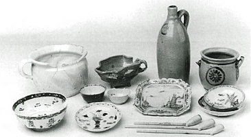 afb. 2. Een deel van het aardewerk van Chinees porselein, dat is gevonden in de 18e eeuwse beerput op het terrein van het Fratershuis. Een aantal van deze vondsten is momenteel te zien in de vitrine in de hal van het stadskantoor.