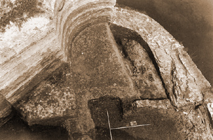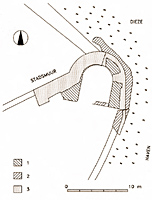 Plattegrond van het opgegraven muurwerk van de wesfelijke toren van de Boompoort. Legenda: 1. eerste helft 14e eeuw 2. verbouwing Boompoort 1448 3. restauratie 19e eeuw Onderzoek aan de buitenzijde van de toren kon toen nog niet plaatsvinden, aangezien 26 deze zich nog in het water bevond. In juni was het mogelijk om aan de buitenzijde een beperkte waarneming te verrichten. In verband met het herstel van de buitenzijde van de toren werd hier een damwand geplaatst en het gedeelte langs de toren leeggepompt. Op vrij grote diepte kwam hierbij de oude fundering van de toren in het zicht. Deze bleek een veelhoekige vorm te hebben (zie afb. 1), in tegenstelling tot de huidige halfronde buitenkant. De hoekige vorm is ook herkenbaar op enkele afbeeldingen uit de 16de eeuw. De toren was op de waterlijn bekleed met grote hardstenen blokken, die het metselwerk moesten beschermen tegen de eroderende werking van het water en tegen beschadiging door schepen. In één van deze blokken was een verticale sleuf uitgehouwen. Het is niet uitgesloten dat deze sleuf samenhangt met een valhek waarmee de haventoegang afgesloten kon worden. Uit de steenformaten van de buitenzijde van de toren blijkt dat deze minder oud is dan de binnenzijde. Vermoedelijk is de hoekige buitenschil aangebracht bij de aanleg van de nieuwe Boompoort in 1448. Na het onderzoek is de hoekige buitenzijde van de toren grotendeels weggekapt. Bij de renovatie zal de toren voorzien worden van een nieuwe, ronde buitenschil. | 26 |