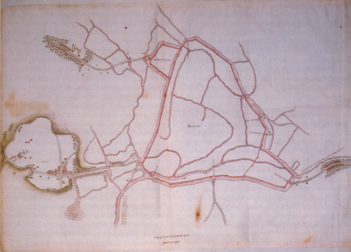 Kaart van 's-Hertogenbosch en omgeving gevonden in het rijksarchief van Turijn. Van de stad zijn alleen de ommuring, de poorten en de waterlopen aangegeven. Hintham, Orthen en Maalstroom.