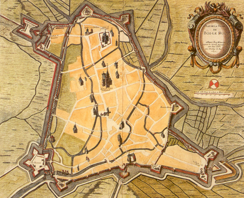 Op deze kaart van de stad in het derde kwart van de 17e eeuw is de stad te zien met alle versterkingen, met uitzondering van de forten. Op de kaart zijn de voornaamste gebouwen, het stratenplan en de loop van de Binnendieze weergegeven. Merk op dat de meeste oude stadspoorten en zelfs de stadsmuren nog aanwezig zijn. Linksonder is het Fort Prins Willem en Maria, beter bekend onder de naam Citadel, aangegeven. Dit fort werd in het midden van de 17e eeuw aangelegd. Het was niet bedoeld als verdedigingswerk maar gebouwd met de bedoeling om de stad onder controle te houden. Om die reden en om reden dat de stad veel rooms-katholieken herbergde werd het fort ook wel 'Papenbril' genoemd. | 41 |