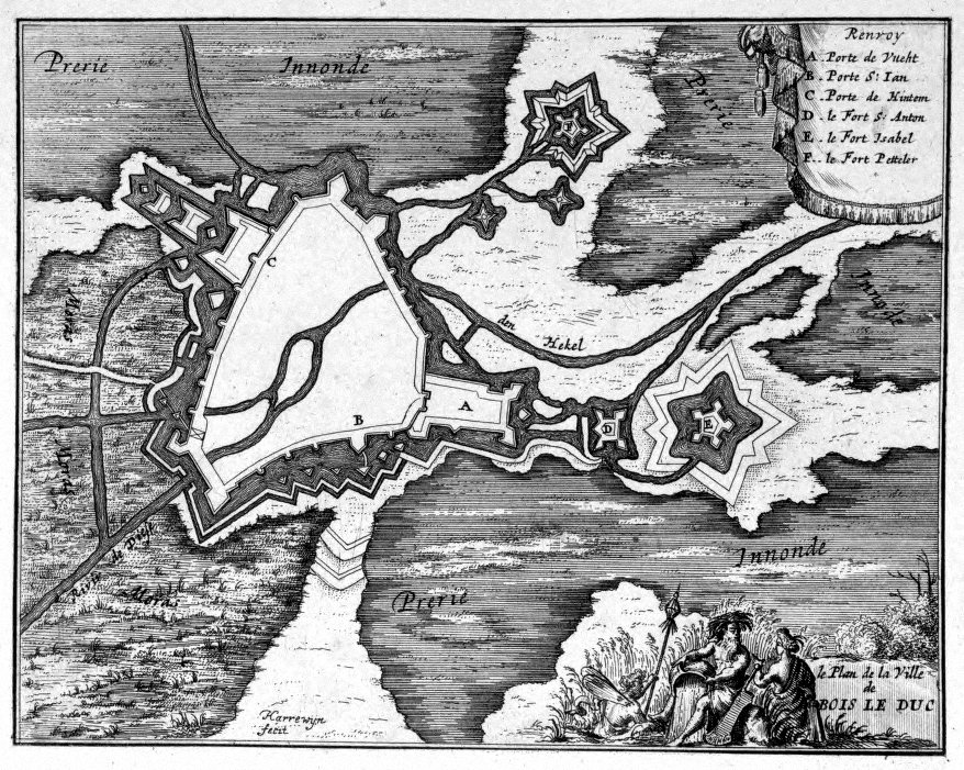 Deze stadsplattegrond van 's-Hertogenbosch werd gegraveerd door Jacques Harrewijn (1660-1727). Harrewijn toont geen belangstelling voor de topografie en het stratenpatroon, maar heeft alleen aandacht voor het militaire grondplan van de stad en haar belangrijkste vestingwerken. |