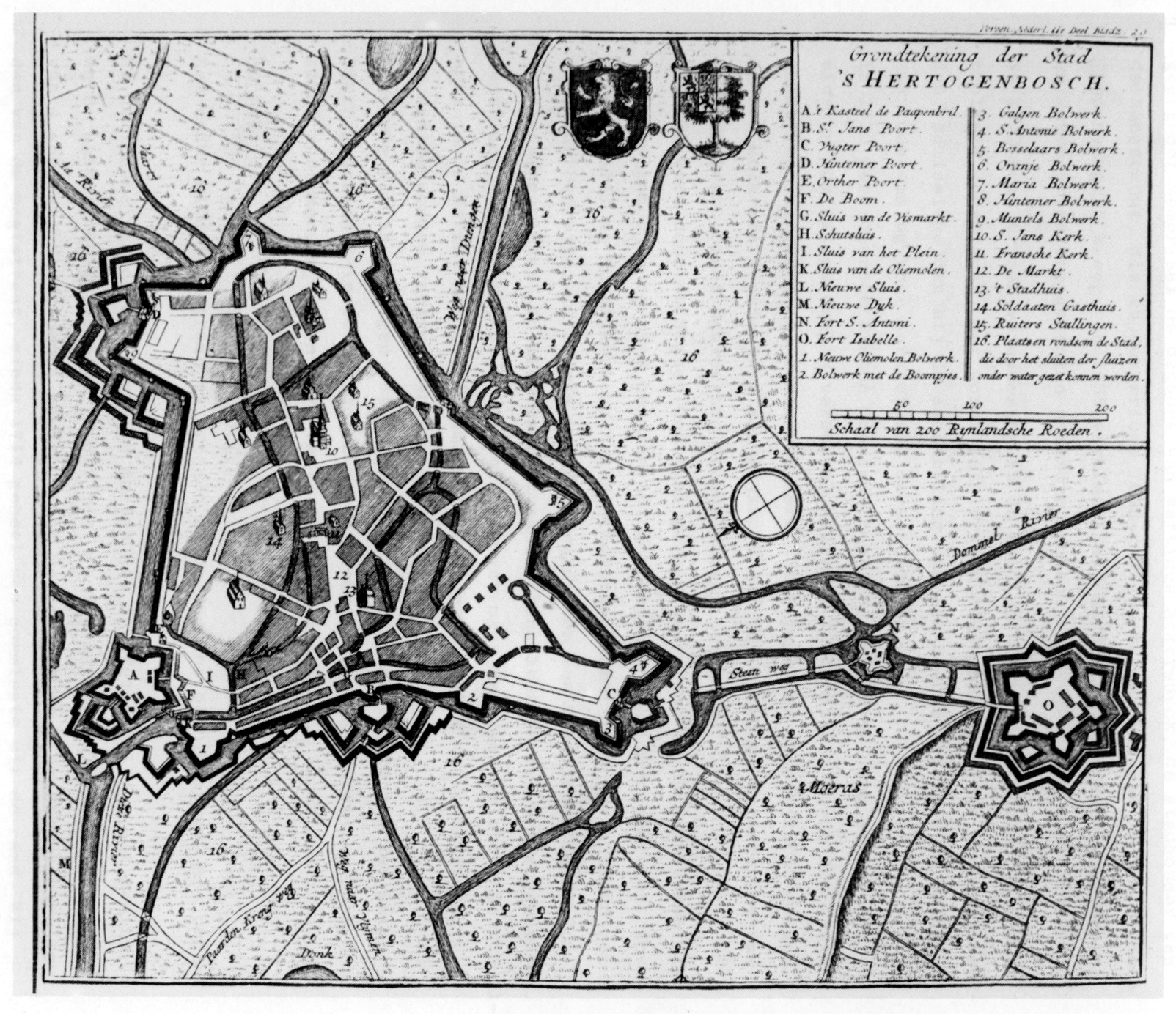 Plattegrond van 's-Hertogenbosch. Middenboven wapens van Brabant en 's-Hertogenbosch, rechstboven: Vereen. Nederl. IIe Deel Bladz. 29, daaronder kader met titel, legende (A-O, 1-16) en schaal, rechtsmiddenop kompasroos, 1739-1772.