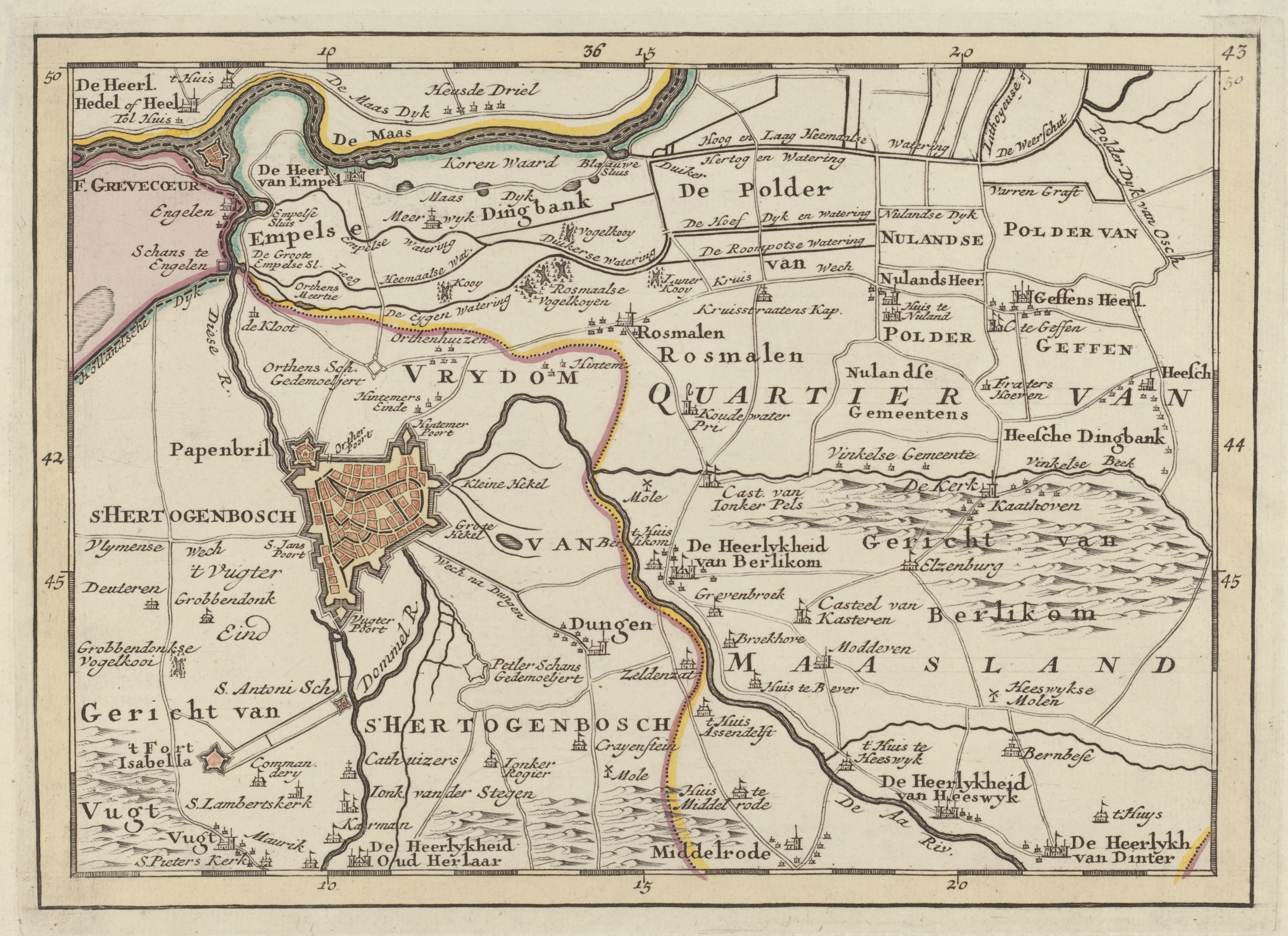 Kaart van een gebied rond 's-Hertogenbosch, begrensd door fort Crèvecoeur (linksboven), de Polderdijk van Osch (rechtsboven), de Heerlijkheid van Dinther (rechtsonder) en Vught (linksonder). Huizen, molens, vogelkooien en forten aangegeven. Middenboven: 36, rechtsboven: 43, middenrechts: 44, middenlinks: 42, (1750).