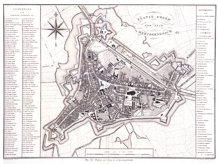 Plattegrond van 's-Hertogenbosch. Met kompasroos en legenda (1-141: A-E: a- z), 1850-1860.