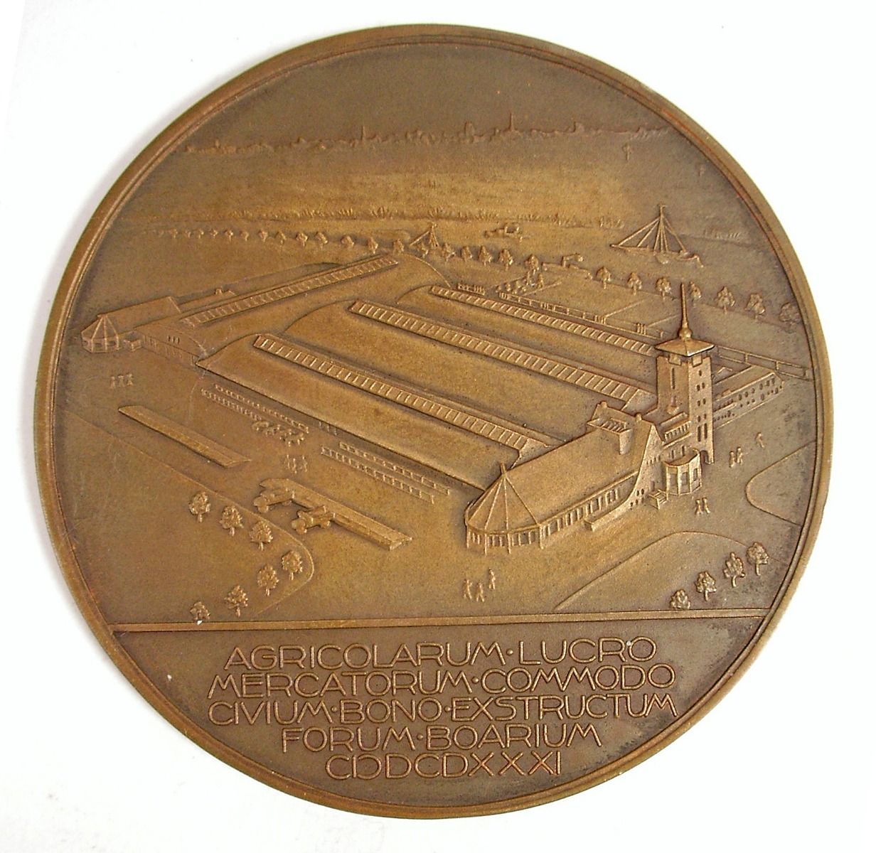 Penning, uitgegeven ter gelegenheid van de opening van de Veemarkthallen te ’s-Hertogenbosch, Vz: Wapen van ’s-Hertogenbosch tussen de letters S C. Kz: Afbeelding van de Veemarkthallen in vogelvlucht met daaronder het opschrift: 'Agricolarum lucro mercatorum commodo civium bono exstructum forum boarium MDCDXXXI'. Ontwerp Jac. van Goor. (K.B. 500). Brons, 60 mm.