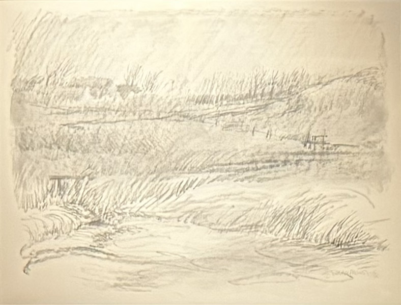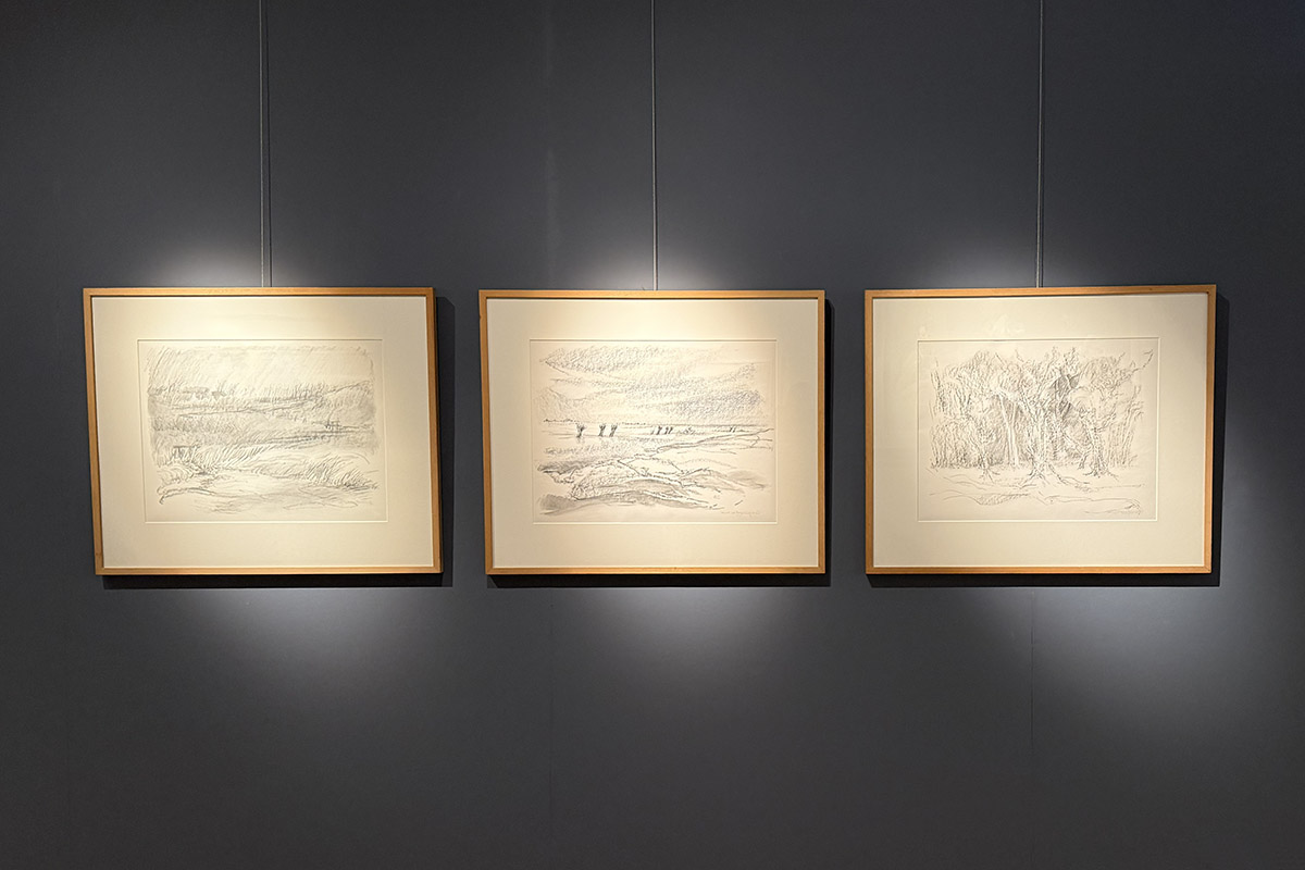 Door de wijze van inlijsten door de kunstenaar zelf, ogen deze tekeningen als een serie. In feite zijn ze echter op verschillende momenten en op verschillende locaties gemaakt. Het zijn drie voorbeelden van de tekeningen die de kunstenaar maakt ein de nabije omgeving. Aleen de middelste draagt een titel: 'Hoog water in de Maas'. |
