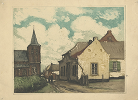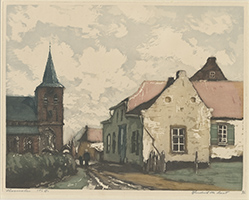 Gezicht op de Sint-Lambertuskerk, met rechts de huizen in de Torenstraat.