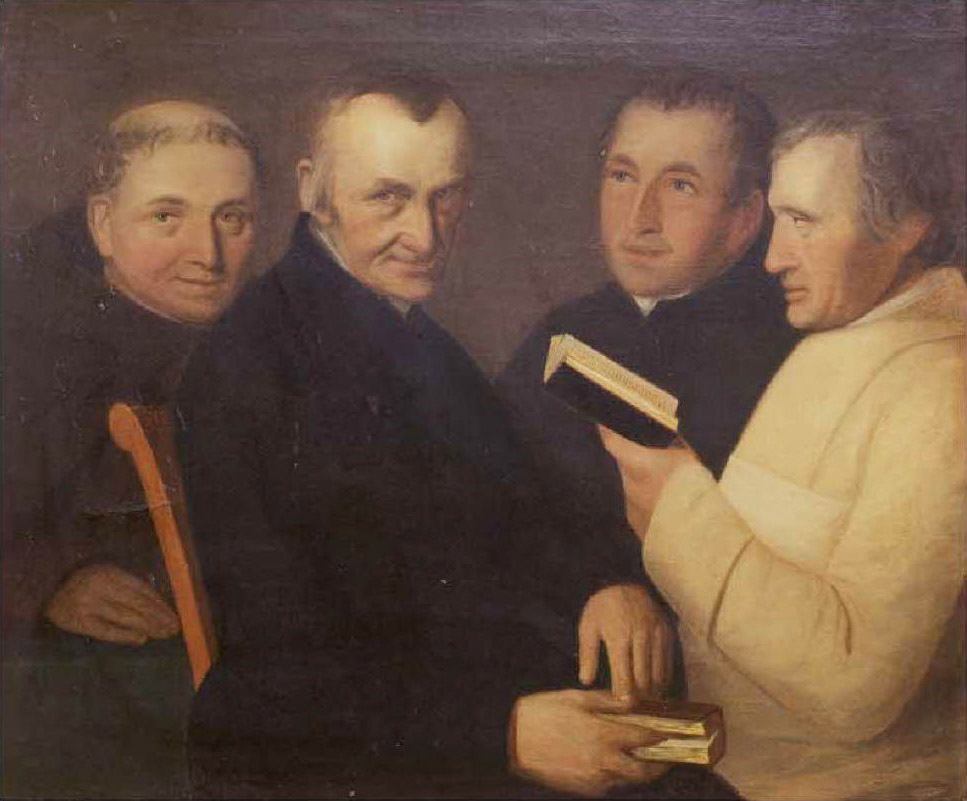 Halffiguren van de opdrachtgever Joannes Baptist(a) / Jan Baptist / Johan Baptist van Hoeck (Helmond 1769 - Vlierden 1844; 1805-12 kapelaan in achtereenvolgens Deurne, Gemert en Mill, 1812-44 pastoor van Vlierden) en zijn drie van zijn dan al geruime tijd overleden volle broers, allemaal geestelijken. Links: Wilhelmus / Willem van Hoeck (Helmond 1763- Gouda? 1831), vanaf 1784 minderbroeder te Erkelenz, vervolgens missionaris en sinds 1791 pastoor te Gouda. Midden: twee wereldheren, zijnde Jan Baptist zelf en tegenover hem de Boxtelse kapelaan en bekende patriot Adrianus / Adriaan van Hoeck (Helmond 1754-Boxtel 1793), helemaal rechts Thomas van Hoeck (Helmond 1762-Helmond 1822), norbertijn van de abdij van Postel(1787) waar hij lector werd, later rector van het nonnenklooster St. Agneete in Emmerich. Volgens de website van Gemeentemuseum Helmond was dit werk de samenvoeging van vier afzonderlijke figuren (zie de drie voorafgaande werken).