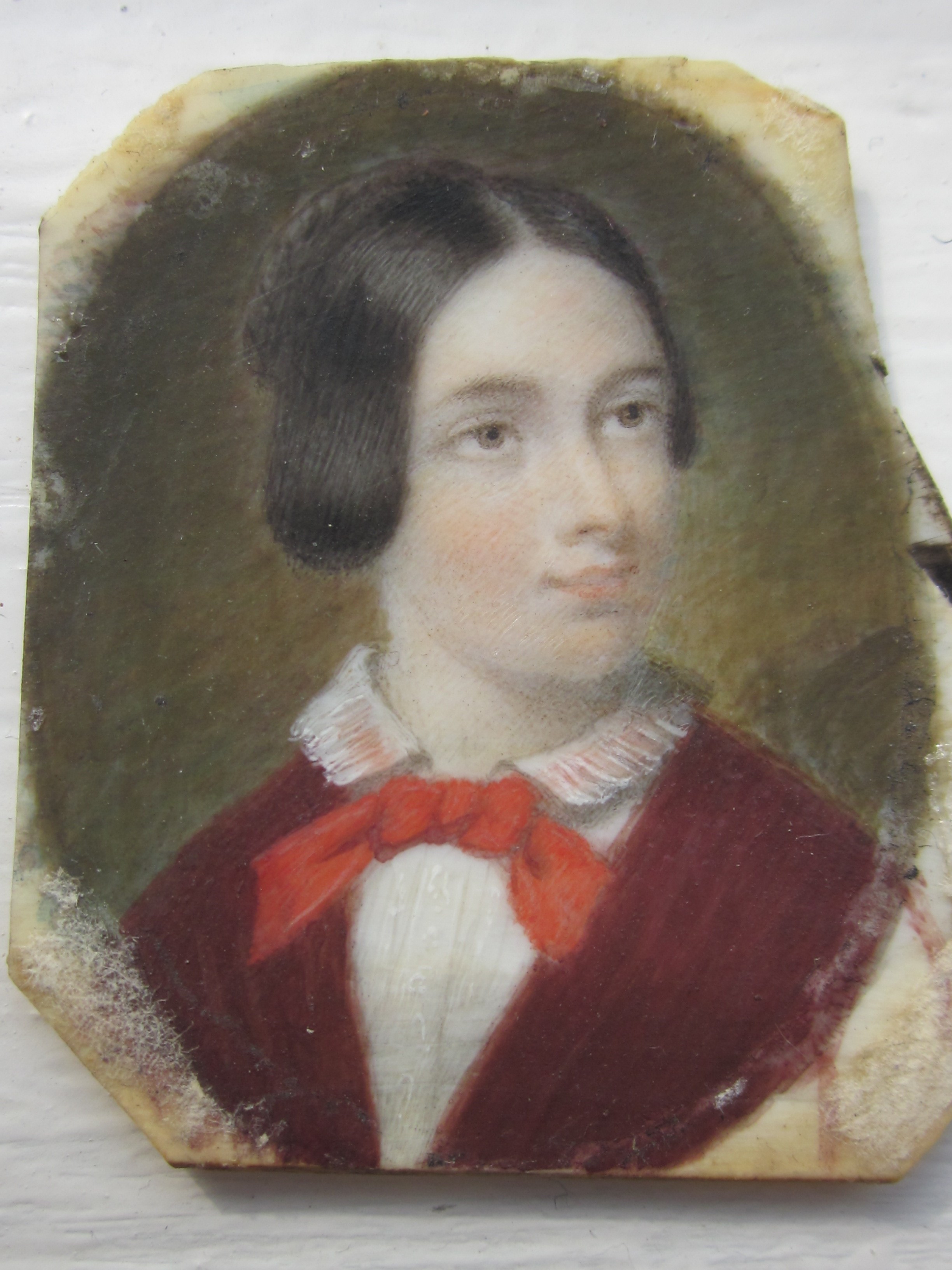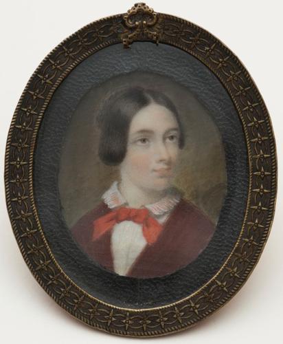 Ovaal miniatuur op ivoor in rond dun ovaal lijstje van messing, geelkoper of brons; achter glas; zwartkunstleren buitenrand van portret is een toevoeging uit ca. 1970.