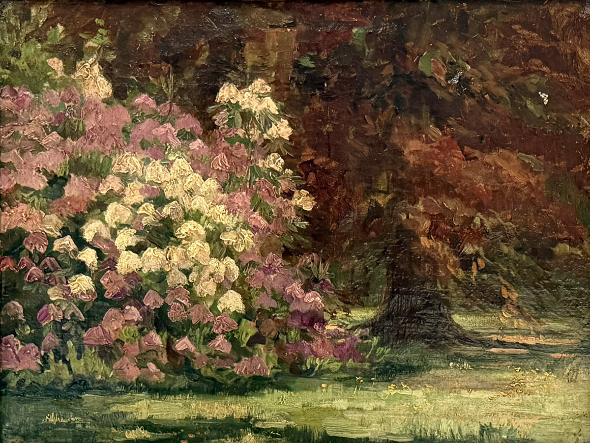 Rhododendrons bij beuk in het park van Regina Coeli te Vught