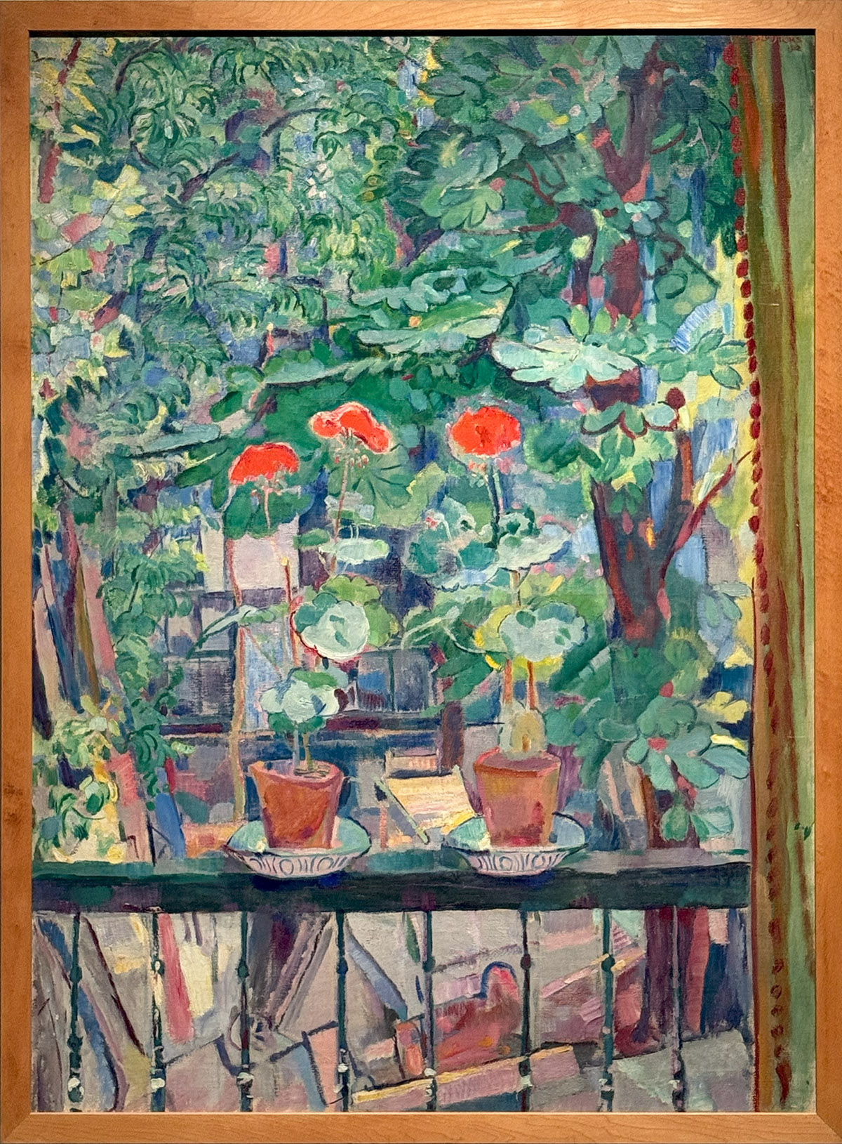 Dit uitzicht vanaf een balkon schilderde Sluijters in zijn woning aan de Bloemengracht in Amsterdam. De invloed van het kubisme is zichtbaar. Sluijters maakte met deze stroming kennis toen hij in 1911 naar Parijs reisde. De geraniums en de balustrade geven houvast in het spel van lijn en kleur.