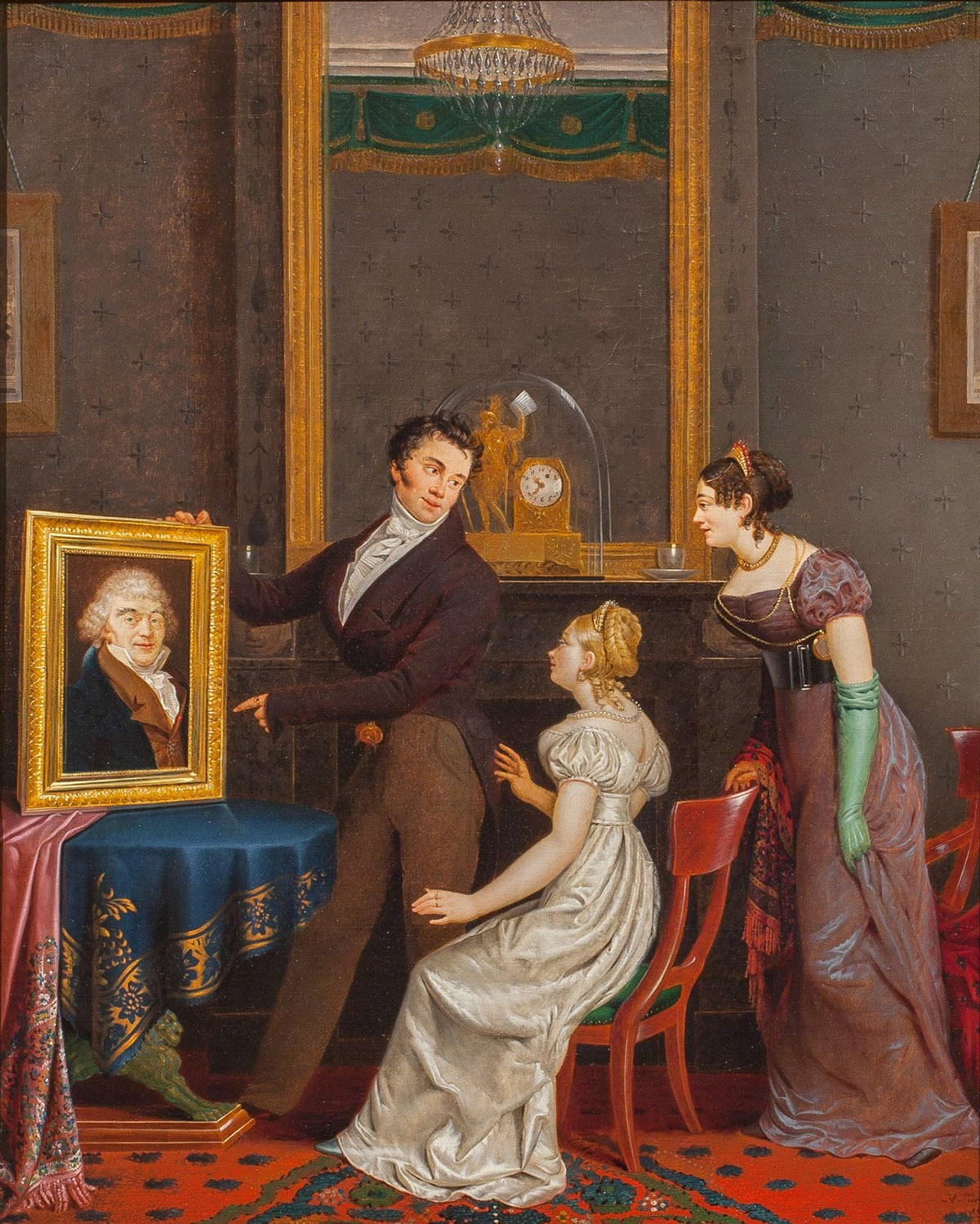 Elegant drietal in bewondering voor het portret van Gerard van Spaendonck