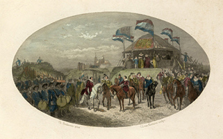 Prins Frederik Hendrik en graaf Ernst Casimir te paard staande op een heuvel met uitzicht op het beleg van 's-Hertogenbosch, 1629. In het midden de prins die met de commandostaf in de rechterhand wijst naar de stad op de achtergrond, rechts de graaf op een schimmel. Op de achtergrond een gezicht op het tentenkamp van de belegerende legers met in de verte het profiel van 's-Hertogenbosch met brandende vestingen.