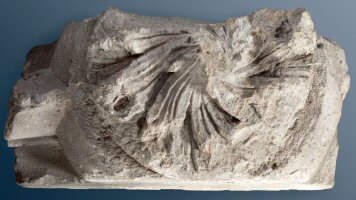 Deze tufstenen sluitsteen is gedecoreerd met ineengedraaid bladwerk. De randprofilering van de schotel en de profilering van de aansluitende gewelfrib is hetzelfde als de sluitsteen met de Christuskop, zodat een overeenkomende herkomst wel aannemelijk is. Het motief met de ineendraaiende bladeren komt met name in de dertiende eeuw veelvuldig voor op sluitstenen in kerken en kathedralen in noord Frankrijk en het Nederrijnland. | 56 |