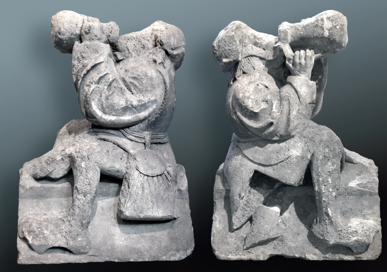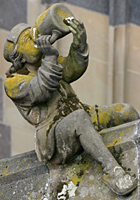 Eveneens aan de noordzijde was het beeld van een drinkebroer, een dronkenlap geplaatst (N-V.2).110 Hoewel het gezicht van het verder goed bewaarde beeld verminkt is, kan overduidelijk de sterk misvormde mond en kin worden waargenomen. Met beide handen zet de figuur een stenen schenkkan of kruik aan de mond. Er zijn nog meer overeenkomsten met het voorlaatste beschreven beeld. Ook deze figuur draagt een soort schort, die aan de onderzijde gescheurde flarden vertoont, over kleding met wijde mouwen. Bovendien draagt hij op het hoofd een muts met grote flappen aan de zijkanten. Verder valt op dat hij trippen, houten overschoenen draagt en een grote gordeltas aan de riem heeft hangen, wat beide op enige welstand zou kunnen wijzen. Mogelijk zijn de uitgebeelde figuren ‘sinnelozen’, die die door overmatig drankgebruik een delirium hebben opgelopen en in de laat-middeleeuwse maatschappij tot de waanzinnigen werden gerekend. Een dergelijke aandoening hield geen rekening met maatschappelijke klasse; het kon iedereen, arm of rijk, overkomen. | 379 |
