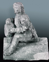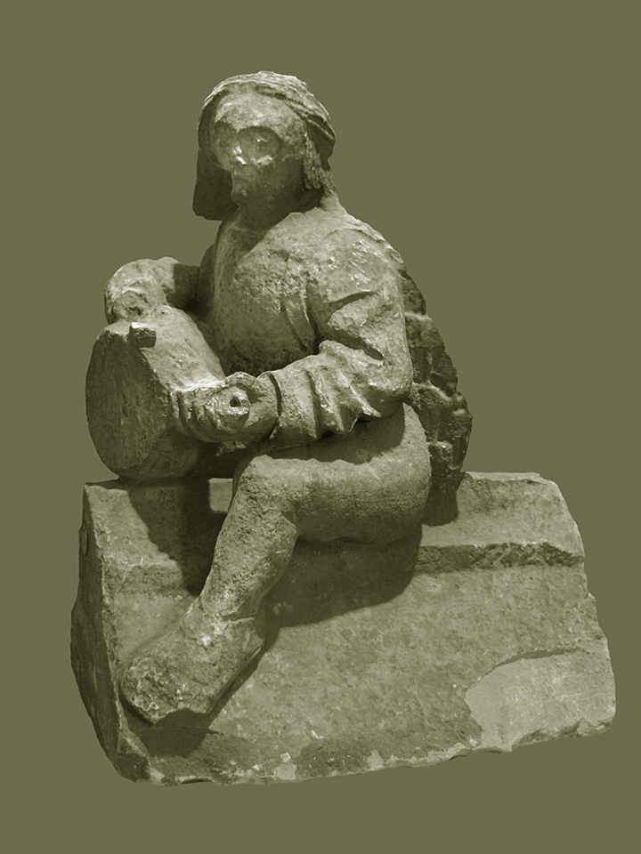 Een tweede man met blaasbalg was op de luchtbogen aan de zuidzijde te zien (Z-III.3).130 De figuur heeft halflang haar en draagt een muts met een aan de linkerzijde afhangende flap. Hij draagt een mouwloos hes over een hemd met lange, wijde mouwen en draagt koemuilen. Voor hem op de boog rust een blaasbalg die wordt vastgehouden alsof het een tokkelinstrument betreft. De hand op de blaasbalg maakt geen tokkelende beweging, maar houdt een afgebroken voorwerp, mogelijk een vork, vast. Het gezicht van de man is weliswaar sterk verweerd, maar het is duidelijk dat er grote overeenkomsten zijn met het gezicht van de juist besproken blaasbalgspeler. Met een riem hangt aan zijn schouders het restant van een grote korf, op oude foto’s nog intact, die doet denken aan de verdwenen maar wel getekende marskramer aan de noordzijde. Het is bekend dat de marskramers vaak samen met de rondreizende speellieden optrokken wanneer zij van stad naar stad reisden. In de ogen van de kerk maakten de marskramers deel uit van de rondtrekkende troep van onmaatschappelijken, zoals kunstenmakers, vaganten en speellieden, maar ook van charlatans en bedelaars die het niet zo nauw namen met zeden, normen en waarden en zij werden dan ook met argwaan bejegend. De laat-middeleeuwse maatschappij was vol wantrouwen jegens de marskramers, ‘wier beroep nog beladen is met de oorspronkelijk negatieve waardering van het koopmanschap in de middeleeuwen als een duivels instituut van bedrieglijke woekeraars’.131 In die zin staat de (nep)muziek makende marskramer gelijk aan de musicerende duivel, die ook op de luchtbogen is uitgebeeld (N-III.4). | 386 |