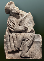 Op de eerste luchtboog aan de noordzijde was een luitspeler geplaatst (N-I.3).120 De figuur zit sierlijk gedraaid op de boog, kijkt omhoog en heeft de deels afgebroken luit ook wat omhoog gestoken. De figuur draagt een van een lap gedraaide muts, heeft een wijde, lange mantel aan en heeft pofmouwen met ingesneden stukken. Verder is de kuitbroek op de kuiten versierd met een band waaraan strikken of tressen hangen en draagt hij koemuilen. Met de overgebleven rechter hand bespeelt de muzikant de snaren van de luit. | 382 |