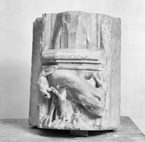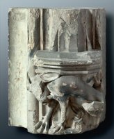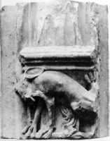 Tegenover het Christuskind is een kraagsteen geplaatst met een goedaardig, gefronst kijkend monster met grote oren (B2). Het beest dat zich met de linker achterpoot onschuldig aan de kop krabt, is een nauwkeurige, aangevulde kopie van de originele sculptuur van Ledesteen die in de bouwloods bewaard is gebleven.79 De haarscherpe details van het origineel, zoals de geklauwde poten met lange tenen, de oren, de scherpe rug en de de flossende staart, verraden de grote kundigheid van de vijftiendeeeuwse beeldhouwer. Vlak voor de restauratie van het portaal in 1896, vervaardigde Lambert Hezenmans een tekening van de kraagsteen, maar vulde deze foutief aan als het gaat om de krabbende voorpoot, die bij het origineel is afgebroken.80 Het is verleidelijk om met de uitbeelding van het onschuldige Christuskind en het goedaardige monster aan de toegangsboog, verband te leggen met de sculptuur van de er achter gesitueerde toegangsdeur. Juist daar wordt de apocalyptische Christus uitgebeeld die zijn stigmata toont. Ook hier zal het voorbestemde leven van Jezus zijn bedoeld. | 276 |