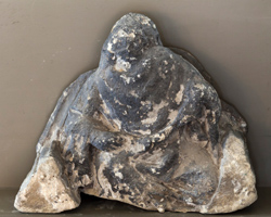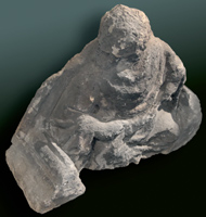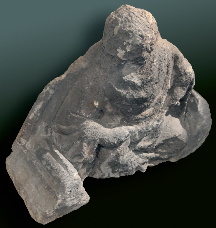 Links van de toegangsdeur was een kraagsteen met een profeet die een banderol in de handen houdt (k151). Deze bleef bewaard in de bouwloods, waar het op enig moment de aantekening “afkomstig van toegangspartij gemeentetoren” kreeg.80 De randen van de aansluitende archivolt en de geprofileerde dekplaat zijn nog steeds afleesbaar en stroken onmiskenbaar met de gerestaureerde situatie. De sterk verweerde profeet - de muts en enige krullen zijn nog herkenbaar - met een kenmerkende gedraaide lichaamshouding en gekanteld hoofd is in grote lijnen door Hezenmans overgenomen. Alleen het hoofd werd vrijwel recht, in plaats van gekanteld uitgebeeld, waardoor het beeldhouwwerk veel minder krachtig is dan het origineel. | 65 |