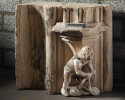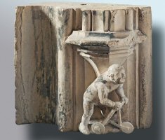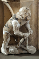 Aan de zuidgevel van de voorhal zijn onder de crêtes van de toegangsbogen vier fraaie kraagstenen aangebracht. Op de meest westelijke kraagsteen bevindt zich een opmerkelijke voorstelling met een bloot, kaal figuurtje, waarschijnlijk is een kind bedoeld, steunend op een loopwagentje met drie wielen (B1). Het is een | 275 |