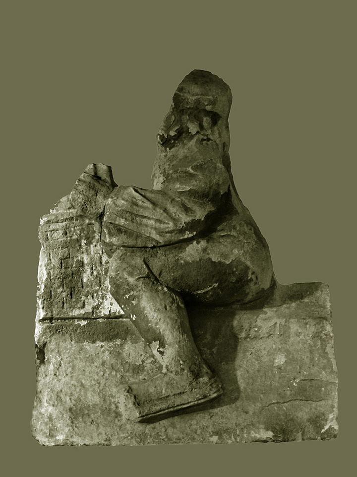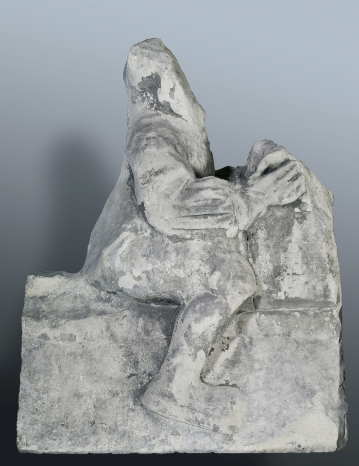Aan de zuidzijde was er een beeld van wat nog het meest op een metselaar lijkt (Z-III.2). De man, waarvan het hoofd nu ontbreekt, heeft voor zich een gemetseld blok waarop zijn handen zijn gelegd, maar details ontbreken echter.112 Op een schets van Lambert Hezenmans heeft het beeld nog een hoofd en draagt het een muts. Nu nog te zien is dat de man koemuilen draagt en sierlijk ingesneden pofmouwen heeft, hetgeen op een wat luxe kleding duidt voor een bouwvakker. De ingesneden pofmouwen zien we verder alleen bij de muzikanten op de bogen, maar van het muurtje voor hem is moeilijk een instrument te reconstrueren. Mogelijk is dit het beeld dat door historicus Jan Hezenmans werd gezien als “de tempelbouwende Salomon”.113 | 379 |