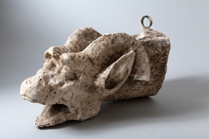 Van een derde spuwer die afkomstig was van het traptorentje is alleen het afgietsel van de kop bewaard.77 Naast een opengesperde bek zien we hier ook weer de bolle ogen en geprononceerde wenkbrauwen. Bovendien heeft de kop spitse oren en kromme hoorns als van een bok. | 65 |