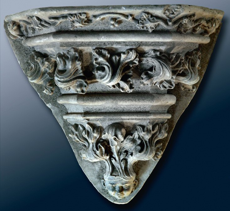 28.Een ontwerpmodel op halve grootte bleef in de bouwloods bewaard. Bouwloods gipsdepot, i-336. Model van het kopje met bladwerk, bouwloods gipsdepot i-306.