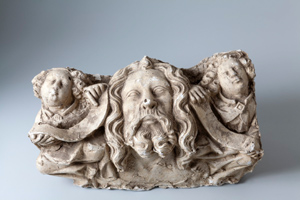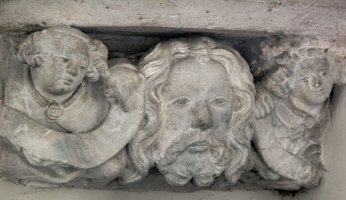 De derde kraagsteen, waarvan ook een gipsafgietsel bewaard bleef, is wellicht één van de fraaiste van de kerk en toont een mannenhoofd, geflankeerd door twee kleinere figuren.95 De man heeft lang, enigszins gestileerd krullend haar, een snor en een gespleten baard en stelt mogelijk Christus voor. Aan weerszijden lijken engelenfiguren te zijn uitgebeeld, al zijn de vleugels niet zichtbaar. De kleine figuren hebben vrij platte gezichten met los krullend haar, houden spreuklinten vast en de linker wijst | 71 |