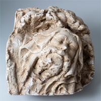 In de hoek ernaast is als kraagsteen k138 een vriendelijk kijkende mannenkop aangebracht.94 De man heeft een lange krullende snor en een krullende gaffelbaard en heeft zijn hoofd bedekt met een sterk geplooide hoofdkap. Bovenop heeft de kraagsteen sterk gestileerd bladwerk onder de dekplaat, die zelf niet authentiek is en pas bij het aanbrengen van het gewelf is gemaakt. | 71 |