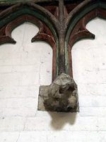 In de zuidelijk koorzijbeuk zijn in de blindnissen onder de vensters enkele kleine kraagstenen geplaatst die de arcaturen dragen. Sommige zijn verplaatst toen de doorgang naar de kapittelzaal werd verruimd of verschoven en andere zijn beschadigd of deels afgehakt toen er altaren of ander meubilair tegenaan werd geplaatst. Een deel is echter goed bewaard gebleven en er werden in de negentiende eeuw ook gipsafgietsels van gemaakt. Vier van de kraagstenen (k165 t/m k168) zijn momenteel niet zichtbaar vanwege de biechtstoelen die ervoor zijn geplaatst. Ongetwijfeld waren er in de eerste travee oorspronkelijk ook dergelijke kraagstenen, maar deze verdwenen al toen de monumentale entree van het Bockkoor werd gemaakt. In de tweede travee bevinden zich twee hoofdeloze figuren, beide vrouwen met puntschoenen. Van de rechter figuur is een afgietsel bewaard (k165).28 De vrouw zit met opgetrokken knieën in een rijk geplooide jurk en heeft een cape om. Beide handen op de schoot, ongetwijfeld ooit een voorwerp vasthoudend, zijn afgebroken. | 89 |