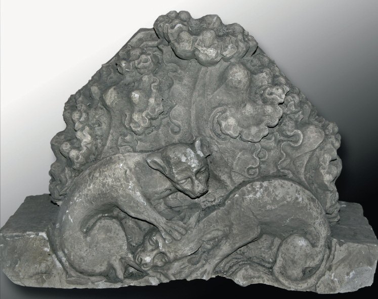 Twee van de kraagstenen die nu als kopie zijn aangebracht, zijn gebaseerd op aangevulde gipsafgietsels die nog in het depot van de bouwloods worden bewaard.172 Zij tonen beide twee spelende of vechtende monsters of honden met loofwerk. Hoeveel van de voorstellingen is gebaseerd op het middeleeuwse beeldhouwwerk, is onbekend aangezien de originele stenen niet bewaard bleven. | 134 |