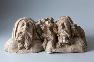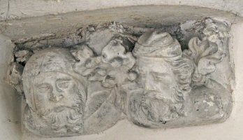 In de omstreeks 1450 tegen de westgevel van het zuidtransept gebouwde sacristie, nu ‘Suissekamer’ genoemd, zijn vier kraagstenen hergebruikt voor de hoeksteunpunten van het ingenieuze opengewerkte gewelf in die ruimte (zie hoofdstuk 6.1). De kraagstenen zijn verschillend van vorm, passend gemaakt voor de nieuwe toepassing, maar stammen wel alle uit het midden van de veertiende eeuw. De brede kraagsteen k137 toont twee mannen waartussen bladwerk is uitgehouwen. Er is een gipsafgietsel bewaard in de bouwloods.93 De linker man is afgebeeld met capuchon of monnikskap, heeft een snor en een typisch krullende gaffelbaard. De rechter man draagt een muts, heeft wijd krullend haar, een lange snor en eveneens een gaffelbaard. Achter hem is ook nog bladwerk zichtbaar. De gezichtsuitdrukkingen en de baarden tonen sterke overeenkomsten met kraagstenen in de doopkapel. | 71 |