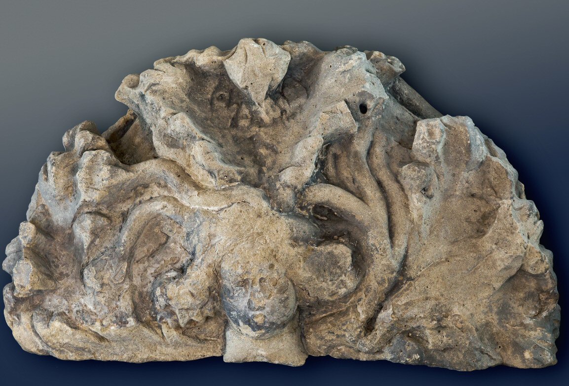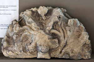 Een mogelijke veertiende-eeuwse herkomst geldt eveneens voor twee kraagstenen in de bouwloods, waarvan niet bekend is wanneer ze in de collectie kwamen. Het betreft vrij platte kraagstenen ten behoeve van de plaatsing van een beeld, waarvan de onderzijde een figuratieve afwerking heeft en het eertijds ingemetselde deel nu ontbreekt. Een kraagsteen heeft centraal een kopje waaromheen een soort krans is weergegeven.72 Vanuit de krans ontspruit welig krullend bladwerk, dat lijkt op de bladeren van met bijvoetblad versierde kraagstenen in de kooromgang. Een vergelijkbare kraagsteen is eveneens in de bouwloods bewaard gebleven, ook zonder dat de context of precieze herkomst is opgetekend. De vrijwel halfronde kraagsteen heeft aan de onderzijde een klein vrouwenkopje met wijd uitstaand haar.73 Als bij Medusa de slangen lijken hier de takken uit het hoofd of tussen de haren van de vrouw vandaan te komen. Het bladwerk vertoont grote gelijkenis met enkele kraagstenen in de kooromgang. De kraagsteen zal daarom vermoedelijk in het midden van de veertiende eeuw zijn gemaakt. | 62 |