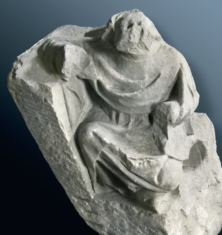 Ernaast was een iets kleinere kraagsteen, die nog steeds in het depot van de bouwloods wordt bewaard (k150).81 Ook hier was een profeet uitgebeeld die een banderol vasthield. De holle vorm van de aansluitende archivolt is nog goed herkenbaar, maar de geprofileerde dekplaat ontbreekt. Het gekantelde hoofd van de profeet is deels bewaard en toont nog duidelijk de haren, de ogen en de aanzet van de baard. In tegenstelling tot de andere profeten draagt deze geen muts of tulband. Opmerkelijk is de kleermakerszit waarin de figuur is uitgebeeld. Hij draagt een wijde, sterk geplooide mantel die op de schouder met een rij knopen of een versierde speld is vastgezet. De beide handen zijn afgebroken maar aan de zijkant van de steen is nog een deel van de banderol zichtbaar. Hoewel sterk beschadigd, is aan deze kraagsteen nog wel de hoge kwaliteit en de verfijndheid van het beeldhouwwerk af te lezen. | 66 |