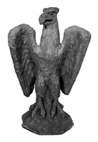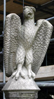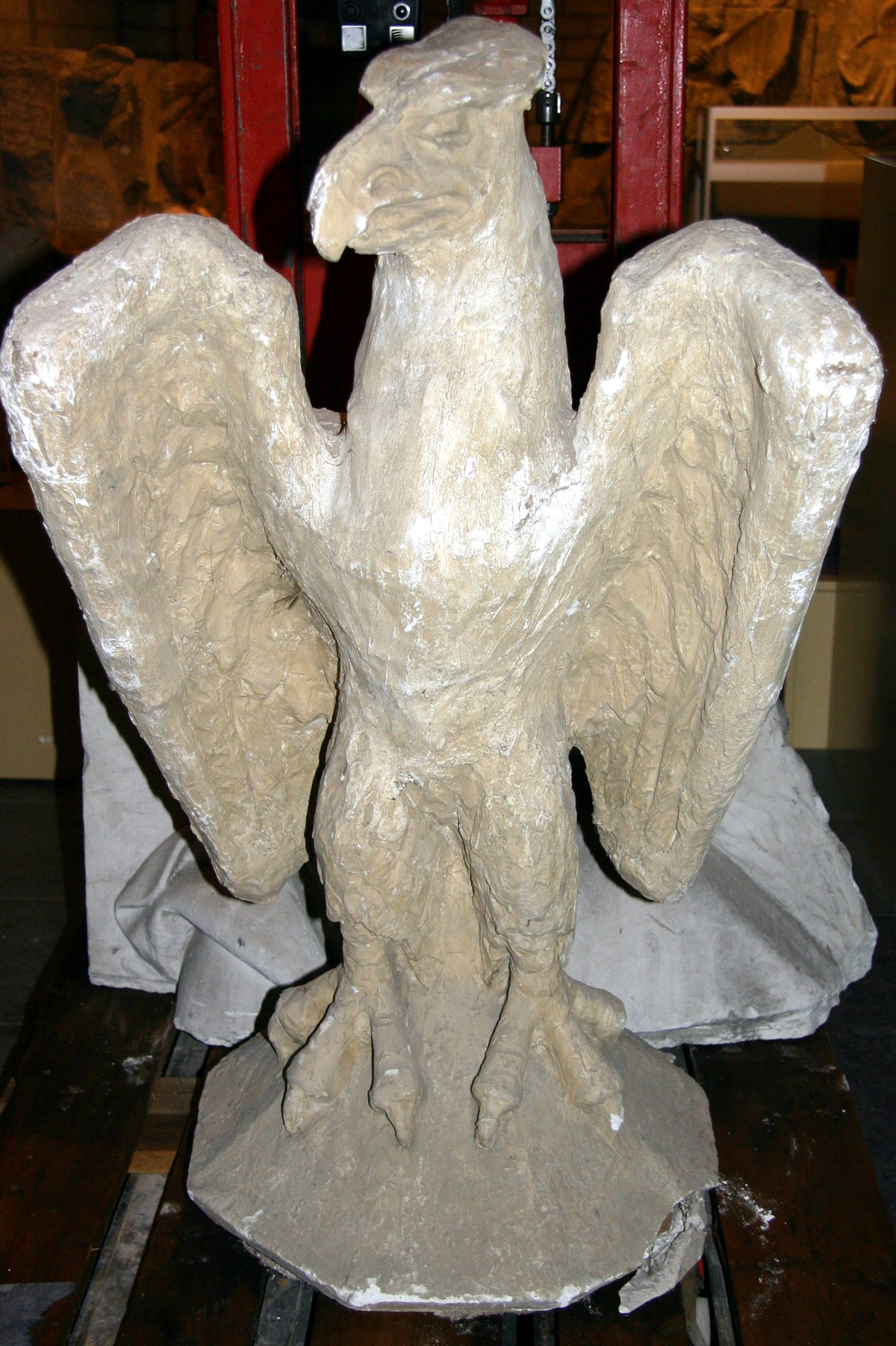Een arend met opengeslagen vleugels, grote klauwen. Het huidige beeld is door Jan Tolboom gehakt in Weidenhahntrachiet en in 1993 geplaatst. Deze kopie verving een arend die in tufsteen was gehakt door Piet van Dongen en in 1946 was geplaatst. Deze originele tufstenen arend bleef samen met het gipsmodel bewaard in de Bouwloods. | 171 |