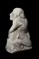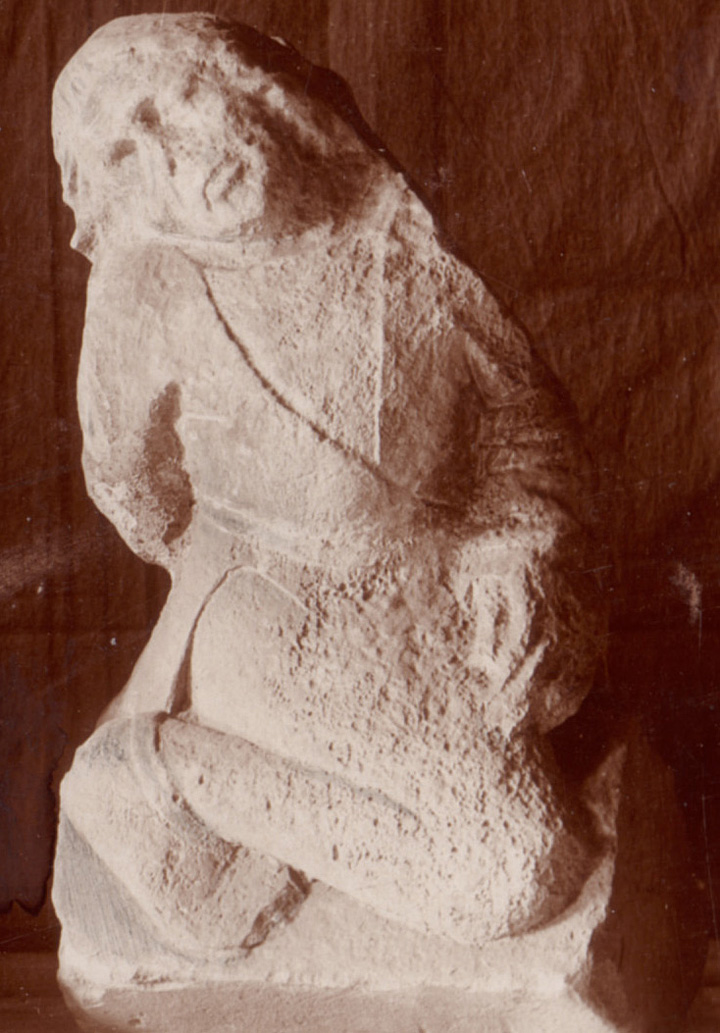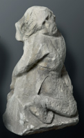Dichtbij was een met één hand vastgebonden man uitgebeeld (N-VI.2).107 De figuur heeft lang haar en draagt een jak met een v-hals en een soort achterflap. De rechter hand van de man zit achter zijn rug met touw vast gebonden aan een boomstronk, terwijl hij de andere hand op schoot heeft. Hij heeft zijn hoofd half achterover gegooid en zit krampachtig gedraaid, door het touw in een vreemde houding. De blik van de man is tegelijk meewarig als gekweld en hij lijkt lijdzaam zijn lot te ondergaan. | 377 |
