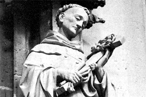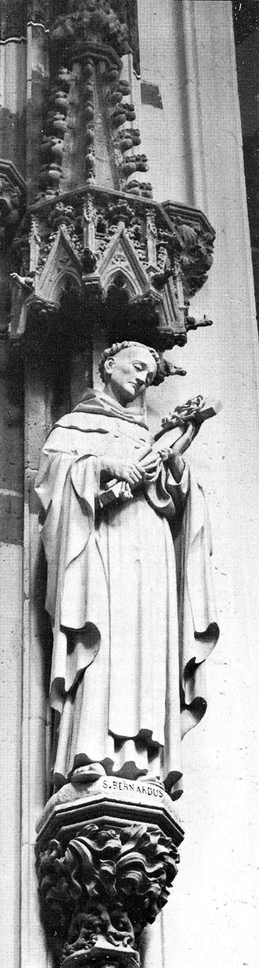 Iconografie: de magere monnik houdt met beide handen een kruis voor zich met een doornenkroon en bekijkt het vol toewijding. Met zijn rechterhand klemt hij bovendien een boek tegen zijn borst. Bij het kruis houdt hij bovendien nog een geselkoord vast. Bernardus van Clairvaux werd omstreeks 1091 geboren op het kasteel Fontaines in Bourgondië. In 1112 trad de jonge edelman met zijn vijf broers en nog dertig edellieden in het kooster van Cîteaux bij Dyon. Hij trok vandaar met enkele gezellen naar Clairvaux, waar hij zijn eigen klooster stichtte. Voor de cisterciënzeorde was het werk van Bernardus van zo'n groot belang dat hij wel als de eigenlijke grondvester van deze orde wordt beschouwd: 68 nieuwe koosterstichtingen staan op zijn naam. Hij was raadgever van verscheidene vorsten, pausen en prelaten. In opdracht van Eugenius III, predikte Bernardus de tweede kruistocht, waarvoor hij ondermeer naar Maastricht kwam. Hij stierf op 20 augustus 1153. In 1174 werd hij heilig verklaard. Paus Pius VIII verhief hem in 1830 tot kerkleraar. | 64 |