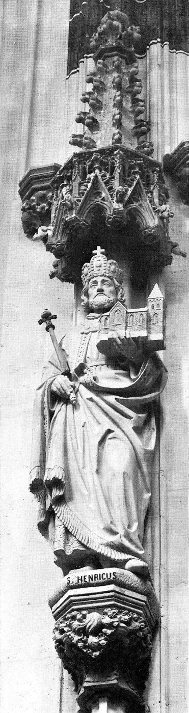 Iconografie: de recht voor zich uitkijkende, gebaarde man draagt op het hoofd de keizerskroon en in zijn rechterhand een scepter. In zijn linkerhand heeft hij een kerkmodel. Omstreeks 973 werd Henricus te Hildesheim geboren als zoon van de gelijknamige hertog van Beieren en diens vrouw Gisela. De heilige Wolfgang, bisschop van Regensburg en de abt van St. Emmeran gaven Henricus een vrome opvoeding. Na de dood van zijn vader werd Henricus in 995 hertog van Beieren; in 1002 werd hij koning van het Duitse rijk en in 1004 ook over Italië. Paus Benedictus VIII kroonde hem in 1014 tot keizer. Als keizer Henricus II bemoeide hij zich intensief met de rijkskerk, benoemde persoonlijk vele bisschoppen en liet talrijke kloosters oprichten. Zijn huwelijk met de heilige Kunigunde van Luxemburg (zie beeld 96) bleef kinderloos. Op 13 juli 1041 stierf Henricus en werd begraven in de door hem gebouwde dom van Bamberg. In 1146 werden Henricus en Kunigunde heilig verklaard. | 65 |