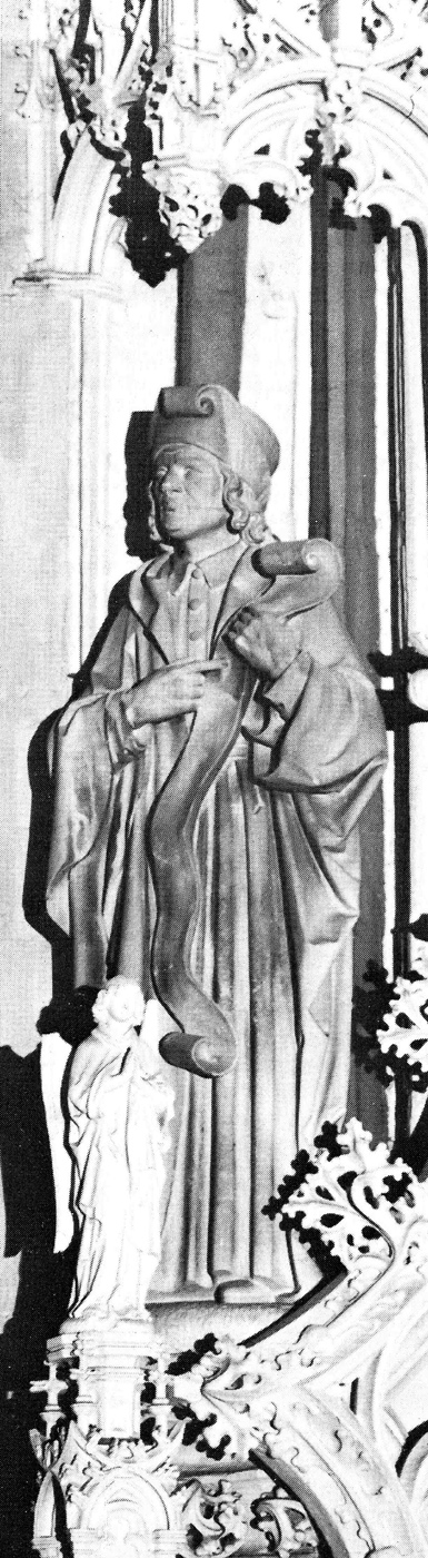 Iconografie: een ouder man met een 'joodse' hoed. In zijn linkerhand houdt hij een lange banderol waarop hij met de rechterhand wijst. Melchisedech, wat 'koning der gerechtigheid' betekent, was priester-koning van Salem (Jerusalem) ten tijde van Abraham, d.w.z. ± 1700 vóór Christus. Melchisedech ging Abraham met brood en wijn tegemoet, toen deze terugkwam van zijn overwinning op de koningen van het oosten en huldigde hem (Gen. 14.18-20). De nakomelingen van Abraham leidden uit deze huldiging hun rechten op de stad Jerusalem af, wat eerst door David werkelijk werd. Als priester-koning is Melchisedech een veel aangehaalde voorafbeeling van Christus en zijn offer van brood en wijn geldt als een prefiguratie van de eucharistie, reden waarom hij in de sacramentskapel is afgebeeld. Paulus noemt Christus in zijn brieven herhaaldelijk 'priester naar de orde van Melchisedech'. De door hem gedragen banderol verwijst naar deze brieven. | 129 |