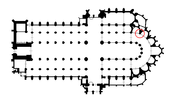 Tegen het muurvlak tussen de zesde en de zevende straalkapel aan de noordoostzijde van de kooromgang, bevindt zich de eerste ‘drielobbige’ kraagsteen die mogelijk werd hergebruikt (k39). Deze kraagsteen is ook te zien op een van de gravures die Servaas de Jong in 1847 maakte. De kraagsteen bestaat uit lange bijvoetbladeren die vanuit een punt uiteen waaieren en onder de dekplaat omkrullen. Het begin- of middelpunt van deze bladeren is echter heel rommelig en ruw bekapt, en het lijkt er sterk op dat hier een centrale sculptuur, wellicht een kop, is weggehakt. Boven de kraagsteen bevindt zich een baldakijn uit de bouwtijd, voorzien van gedetailleerde microarchitectuur. Slechts kleine details werden bij een laat negentiende-eeuwse restauratie aangevuld. Aan weerszijden van het baldakijn zitten twee kleine kraagstenen, die onderling sterk verschillen. De rechter kraagsteen heeft sterk krullend bladwerk, dat ontspringt uit een openbarstende knol (k39b). De linker (k39a) heeft niet alleen een dekplaat met een geheel afwijkende profilering, ook het bladwerk is puntiger en heeft meer weg van distelblad. Het bladwerk ontspringt hier niet uit een knop of bloem, maar uit een schotel met een zogenaamd bladmasker; een gezicht dat bedekt is met bladeren. Van dit bladmasker wordt in de bouwloods een afgietsel bewaard.13 | 154 |