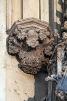 Tegen het muurvlak tussen de zesde en de zevende straalkapel aan de noordoostzijde van de kooromgang, bevindt zich de eerste ‘drielobbige’ kraagsteen die mogelijk werd hergebruikt (k39). Deze kraagsteen is ook te zien op een van de gravures die Servaas de Jong in 1847 maakte. De kraagsteen bestaat uit lange bijvoetbladeren die vanuit een punt uiteen waaieren en onder de dekplaat omkrullen. Het begin- of middelpunt van deze bladeren is echter heel rommelig en ruw bekapt, en het lijkt er sterk op dat hier een centrale sculptuur, wellicht een kop, is weggehakt. Boven de kraagsteen bevindt zich een baldakijn uit de bouwtijd, voorzien van gedetailleerde microarchitectuur. Slechts kleine details werden bij een laat negentiende-eeuwse restauratie aangevuld. Aan weerszijden van het baldakijn zitten twee kleine kraagstenen, die onderling sterk verschillen. De rechter kraagsteen heeft sterk krullend bladwerk, dat ontspringt uit een openbarstende knol (k39b). De linker (k39a) heeft niet alleen een dekplaat met een geheel afwijkende profilering, ook het bladwerk is puntiger en heeft meer weg van distelblad. Het bladwerk ontspringt hier niet uit een knop of bloem, maar uit een schotel met een zogenaamd bladmasker; een gezicht dat bedekt is met bladeren. Van dit bladmasker wordt in de bouwloods een afgietsel bewaard.13 | 154 |