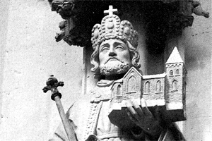 Kraagsteen k46 heeft sterk gestileerde, krullende maar vrijwel symmetrische koolbladeren die voort lijken te komen uit de nekring. Boven het neogotische beeld van de heilige Henricus is een baldakijn uit de bouwtijd bewaard dat grote overeenkomst heeft met dat boven k47. Voor het rijk gehouwen tufstenen baldakijn werden bij de restauratie alleen enkele spuwertjes toegevoegd. De twee kraagstenen aan weerszijden van het baldakijn verschillen sterk; zelfs de profileringen van de dekplaten zijn afwijkend. De linker kraagsteen (k46a), waarvan een afgietsel in de bouwloods wordt bewaard, heeft gestileerde koolbladeren die voortkomen uit een hangende bloem, een zogenoemde Engelse roos.8 De rechter kraagsteen (k46b) heeft ook koolbladeren onder de dekplaat, maar die komen voort uit een vrouwenkopje dat vriendelijk recht naar beneden kijkt. Het haar van de vrouw is gekapt in strengen, die overgaan in de stengels van de sterk gekrulde koolbladeren die de dekplaat ondersteunen. Ook van deze kraagsteen wordt een afgietsel bewaard in de bouwloods.9 | 147 |