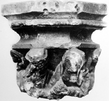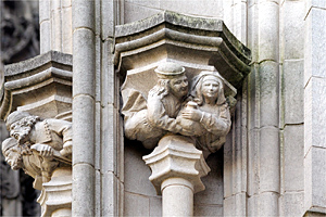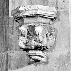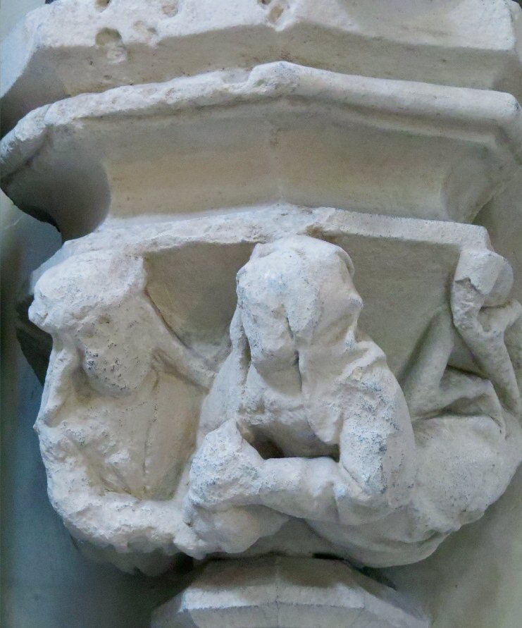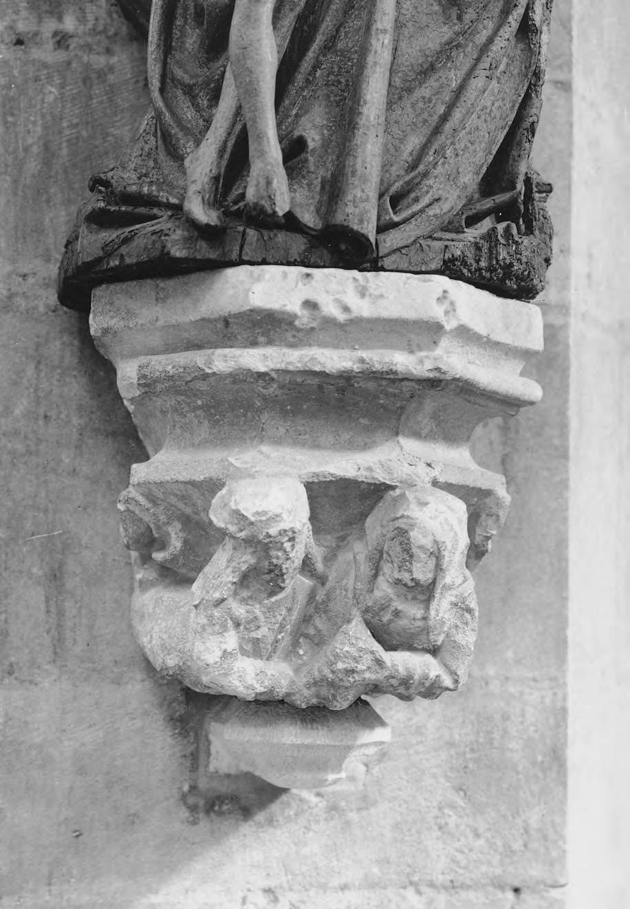 Kraagsteen B7 toont een man (links) en een vrouw die samen een zak, mogelijk een geldbuidel vasthouden. Hoewel de kraagsteen beschadigd is, kunnen de details nog grotendeels worden afgelezen. De man met lang golvend haar draagt een pet of hoed, de vrouw, goed gekleed, een kap. Volgens Mosmans verbeeldt de steen geen inhaligheid, maar juist dankbaarheid voor het gekregene.69 De originele kalkstenen kraagsteen bevindt zich nu in de noordelijke koorzijbeuk. | 325 |