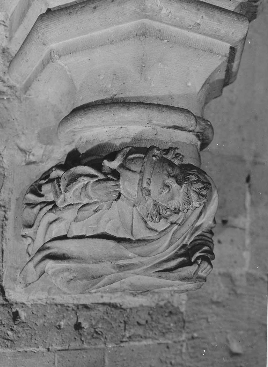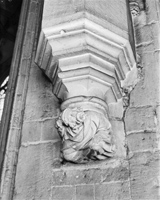| 86. | Volgens een negentiende-eeuwse schets van Hezenmans in de collectie van het Museum voor Religieuze Kunst in Uden, later door hem uitgewerkt tot een door Mosmans gepubliceerde tekening, waren de hoofdmaten van de toen nog completere steen 25 bij 15 cm, wat aanzienlijk kleiner is dan de twee andere kraagstenen uit het portaal. Bouwloods i-39, Koldeweij 1989 54; Mosmans 1931, 43; Rackham 2003, 42, MRK Uden, inv.nr. 2632A. |