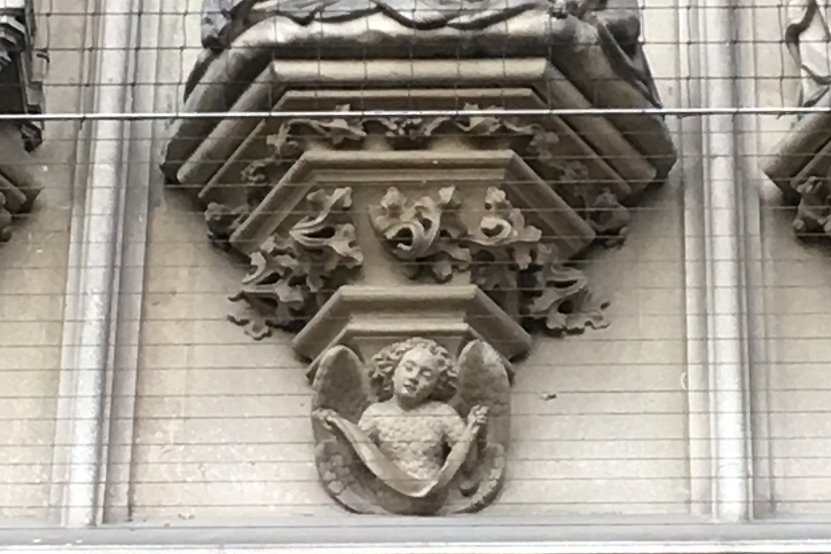 Onder het beeld van Esther is een kraagsteen gemaakt met een geheel gevederde cherubijn die een banderol ophoudt. De engel is gehakt naar een tot 1860 in situ bewaard gebleven kraagsteen, getekend door de gebroeders Donkers en Servaas de Jong. Ook is er nog een ander schetsblad waarop de gebroeders Donkers één van de vier kraagstenen met engelen tekenen, zonder erbij te vermelden welke. Vermoedelijk betreft het 12A. Voor de nieuw te hakken kraagsteen is omstreeks 1860 een gipsmodel gemaakt dat in het depot van de bouwloods bewaard bleef.37 | 59 |