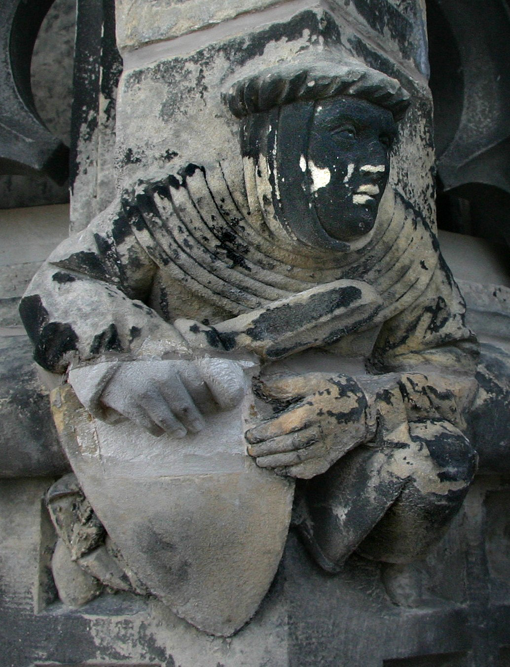 Zandstenen kraagsteen uit 1860 van een gehurkte man (een 'landsknecht?) met hoofdband en muts, een klein zwaard en een schild. Bij de laatste restauratie werd een klein stuk van de kraagsteen vernieuwd. In de bouwloods bleef het oorspronkelijke gipsmodel bewaard.108 | 129 |