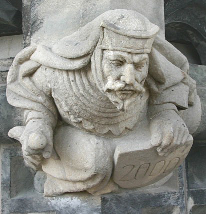 Kraagsteen met een gehurkte man, een ridder, bebaard net hoofdkap, zwaard in de rechterhand en steunend met de linkerhand op een schild. In het schild staat het jaar 2009. De kraagsteen is bij de laatste restauratie vernieuwd in zandsteen en vervangt een kalkstenen kraagsteen uit 1962, waarin ook het jaar 1962 staat. Deze kraagsteen is in 2010 opgenomen in de collectie van de bouwloods.109 De originele steen, waarin mogelijk het jaartal 1860 stond, is niet bewaard gebleven; wel in de bouwloods het oorspronkelijke ontwerpmodel van gips.110 | 130 |