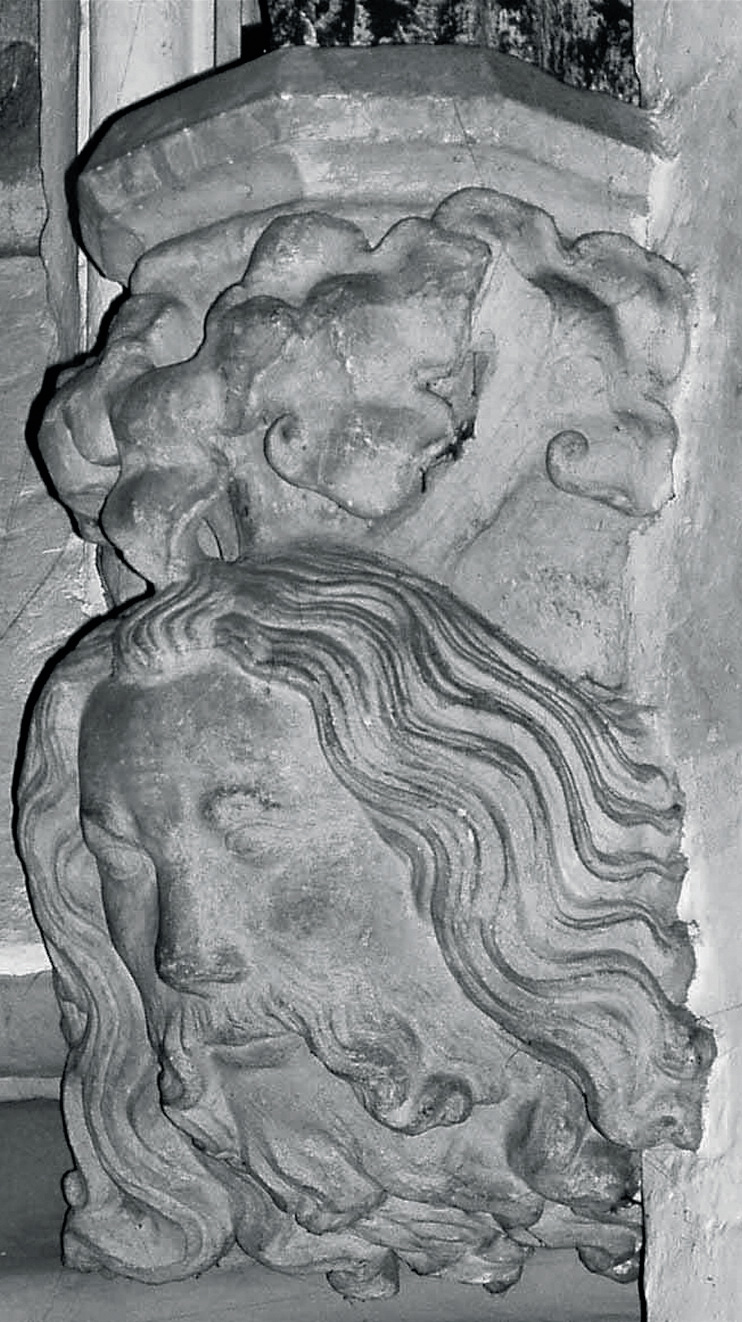 Aan weerszijden van de scheiboog die toegang geeft tot de middelste straalkapel zijn bijna op ooghoogte twee kraagstenen aangebracht die wat de stijl betreft sterk afwijkend zijn van de rest van de sculptuur van de straalkapellen. Dat geldt overigens ook voor het gebruikte materiaal. Terwijl vrijwel alle sculptuur aan de straalkapellen van tufsteen is, is voor deze twee kraagstenen kalksteen gebruikt. Dit kan ook de stijl beïnvloeden, omdat kalksteen een fijnere steenbewerking toelaat dan tufsteen. De zuidelijke kraagsteen k160 toont een mannenhoofd met lang golvend haar, een lange snor en een gestileerd krullende baard. Opvallend zijn de fronsende wenkbrauwen en het gerimpelde voorhoofd. Boven het hoofd is onder een geprofileerde dekplaat eenvoudig bladwerk aangebracht. Een fraai gipsafgietsel is in de bouwloods opgeslagen (i-589). Aan de noordzijde van de scheiboog is eveneens een mannenhoofd te zien (k161). Ook hiervan is een afgietsel gemaakt dat in de bouwloods wordt bewaard. De man heeft sterk gestileerd krullend haar, een lange snor en krullende baard. Ook hier valt de fronsende blik van de man op, met het sterk gerimpelde voorhoofd. Onder de geprofileerde dekplaat is boven het hoofd wederom eenvoudig bladwerk verwerkt, doch geheel anders dan bij de hiervoor beschreven pendant. Dit bladwerk doet het meest denken aan de drielobbige kraagstenen en kapitelen in de doopkapel. De vorm en | 73 |