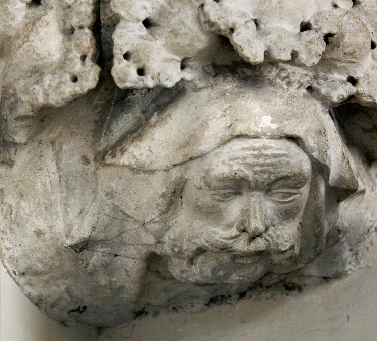 In de hoek ernaast is als kraagsteen k138 een vriendelijk kijkende mannenkop aangebracht.94 De man heeft een lange krullende snor en een krullende gaffelbaard en heeft zijn hoofd bedekt met een sterk geplooide hoofdkap. Bovenop heeft de kraagsteen sterk gestileerd bladwerk onder de dekplaat, die zelf niet authentiek is en pas bij het aanbrengen van het gewelf is gemaakt. | 71 |