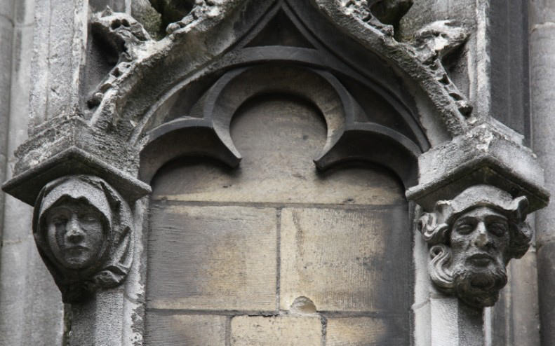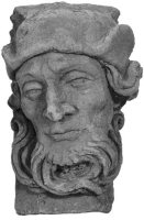 De kraagsteen bevat het hoofd van een bebaarde man met wilde krullende haren en een hoed op. Het is een restauratieproduct van Franse kalksteen. Van deze kop is een kleimodel (schaal 1:2) in de bouwloods bewaard gebleven. | 27 |